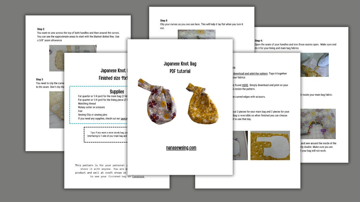 This Japanese knot bag pattern includes the pattern for the actual bag plus step by step instructions to show you how to make the bag.